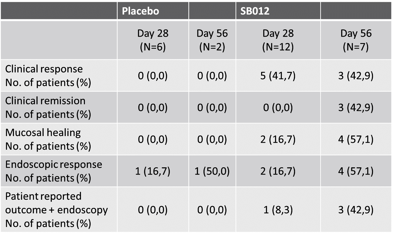 As previously reported, at day 28, there was a statistically significant improvement in the Mayo Score in the SB012 group compared with the placebo group (p = 0.044). In the SB012 treated patients, the Mayo Score dropped from 8.4 ± 1.7 (n = 13) at baseline to 6.5 ± 2.6 (n = 13) at day 28 (p = 0.004), and 5.0 ± 3.5 (n = 7) at day 56 (p = 0.016). In the placebo group, the Mayo Score was 10.0 ± 2.1 (n = 6) at baseline, and 9.0 ± 1.3 (n = 6) at day 28 (not significant; ns), and 9.0 ± 1.4 (n = 2) at day 56 (ns).